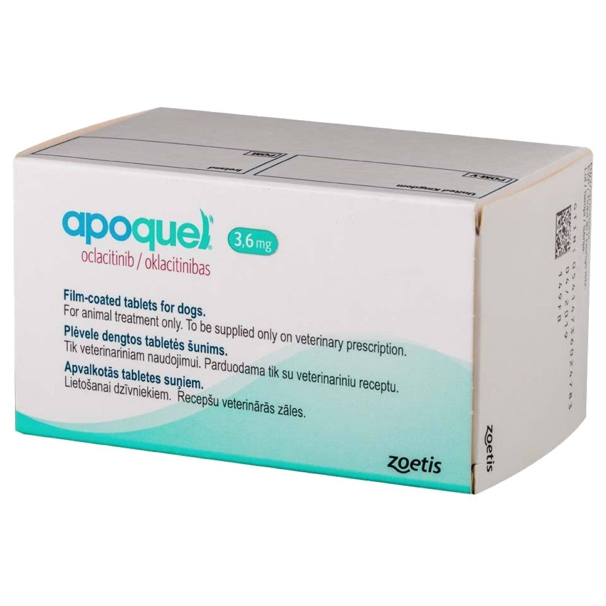 Apoquel 3.6mg Tablets are for the treatment of pruritus associated with allergic dermatitis, and the treatment of clinical manifestations of atopic dermatitis in dogs.
